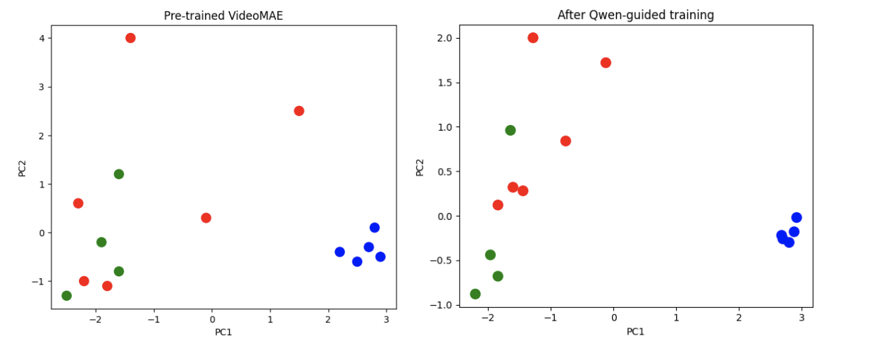 While VideoMAE provides strong visual features, it lacks world knowledge